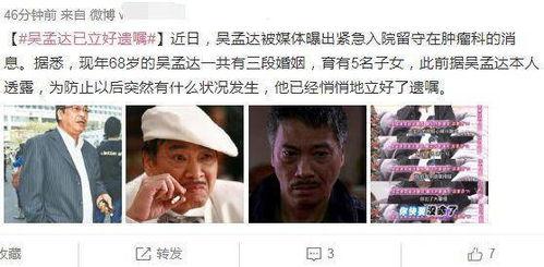 最近网上可是炸开了锅,大家都在热议一个消息——吴孟达病重的视频。这位曾经给我们带来无数欢乐的喜剧大师,如今却让人心疼不已。下面就让我带你一探究竟,看看这个视频背后到底隐藏着怎样的故事。